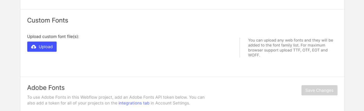 In case you need a custom or premium font that is not available on Webflow, you can always go to Project Settings > Fonts and you will be able to upload custom fonts, or connect your Adobe Fonts account.