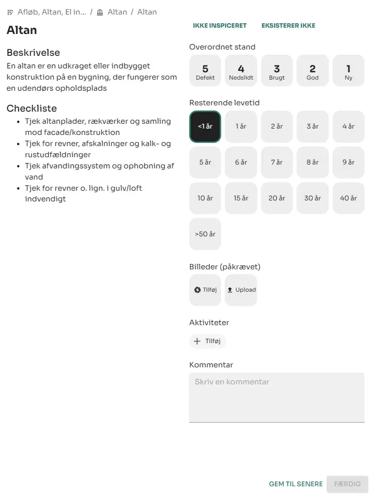 Vores AI-modeller har allerede hjulpet med at gøre vurderingsprocessen mere datadrevet, men vi ved, at der stadig er behov for manuel inspektion af bygningerne. Det er her, vores nye beskrivelser og checklister kommer ind i billedet. De er udviklet for at sikre en mere struktureret og ensartet metode til vurdering af bygningsdele, så resultaterne bliver mere sammenlignelige og pålidelige.